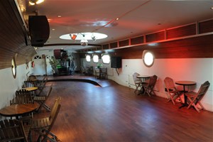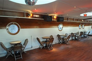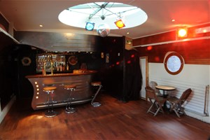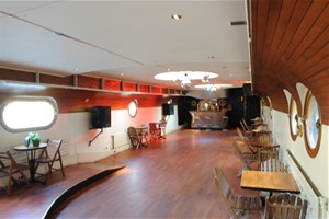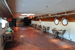 Le pont inférieur avec son bar en acajou et inox sera le lieu de vos réunions, soirées dansantes, cocktail ou dîner. L'acoustique et la sonorisation y sont très soignées tout comme les formules culinaires proposées et la belle carte des vins.